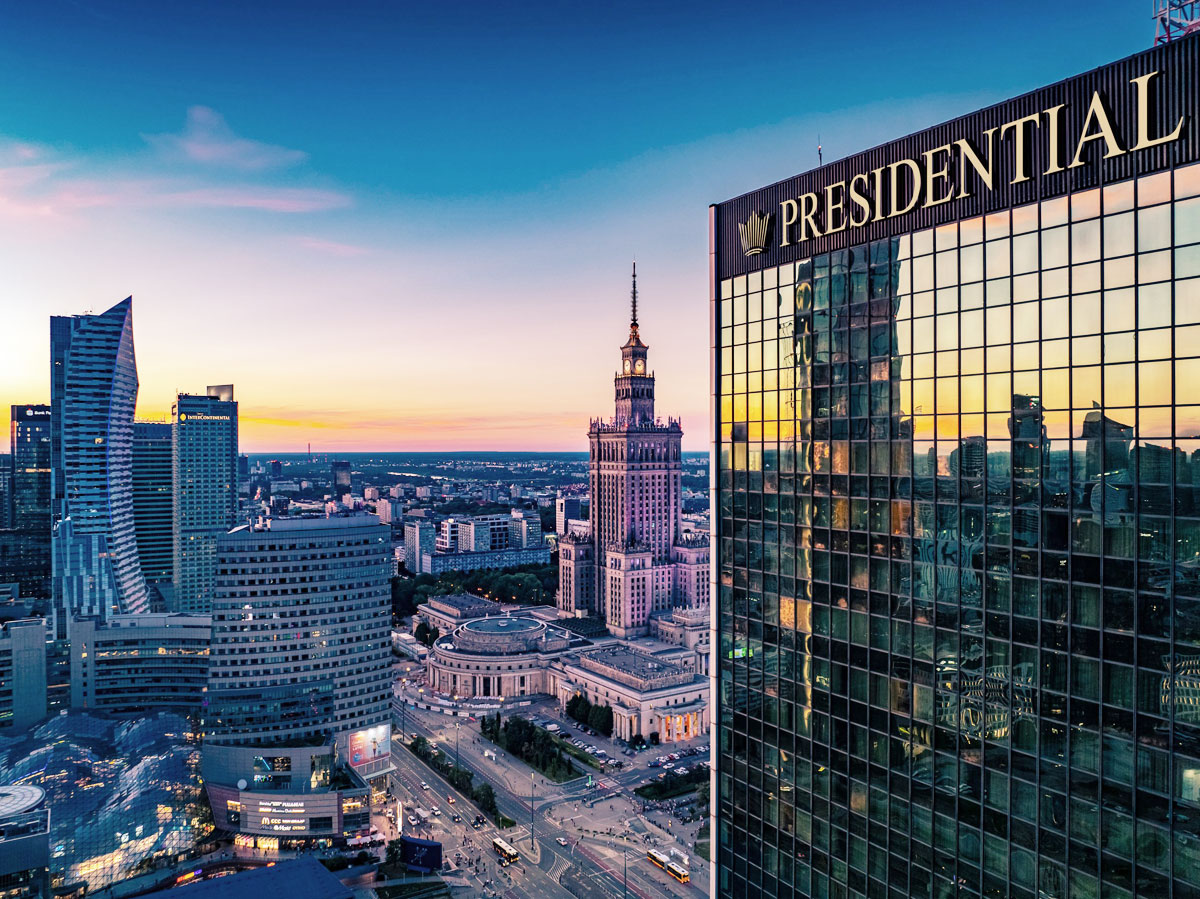 Poland's largest full-service branded hotel. Combines unsurpassed luxury, modern sophistication, and cutting-edge technology with shopping arcade, restaurant, panoramic bar, and luxurious spa with indoor pool.